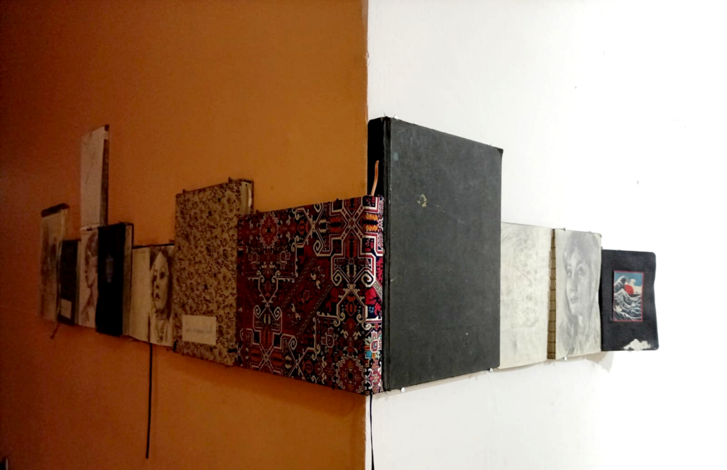 En el laboratorio he entendido a crear colecciones (historias, relatos, objetos, fotografías, dibujos, etc) que relatan discursos a partir de ese aparente sencillo acto de agrupar, enmarcar e hilar. Para esta exposición he elegido mi colección de libretas, situando como protagonista los bosquejos ylos experimentos que cargo siempre en mi maleta. Esta instalación la entiendo como un fuselaje de papel, los cuales evocan ese recuerdo físico que tengo mi persecución con el acto de dibujar, como quien recaba cada apertura de tiempo para acoger un oficio y reviste la propia piel como el lomo de una libreta.