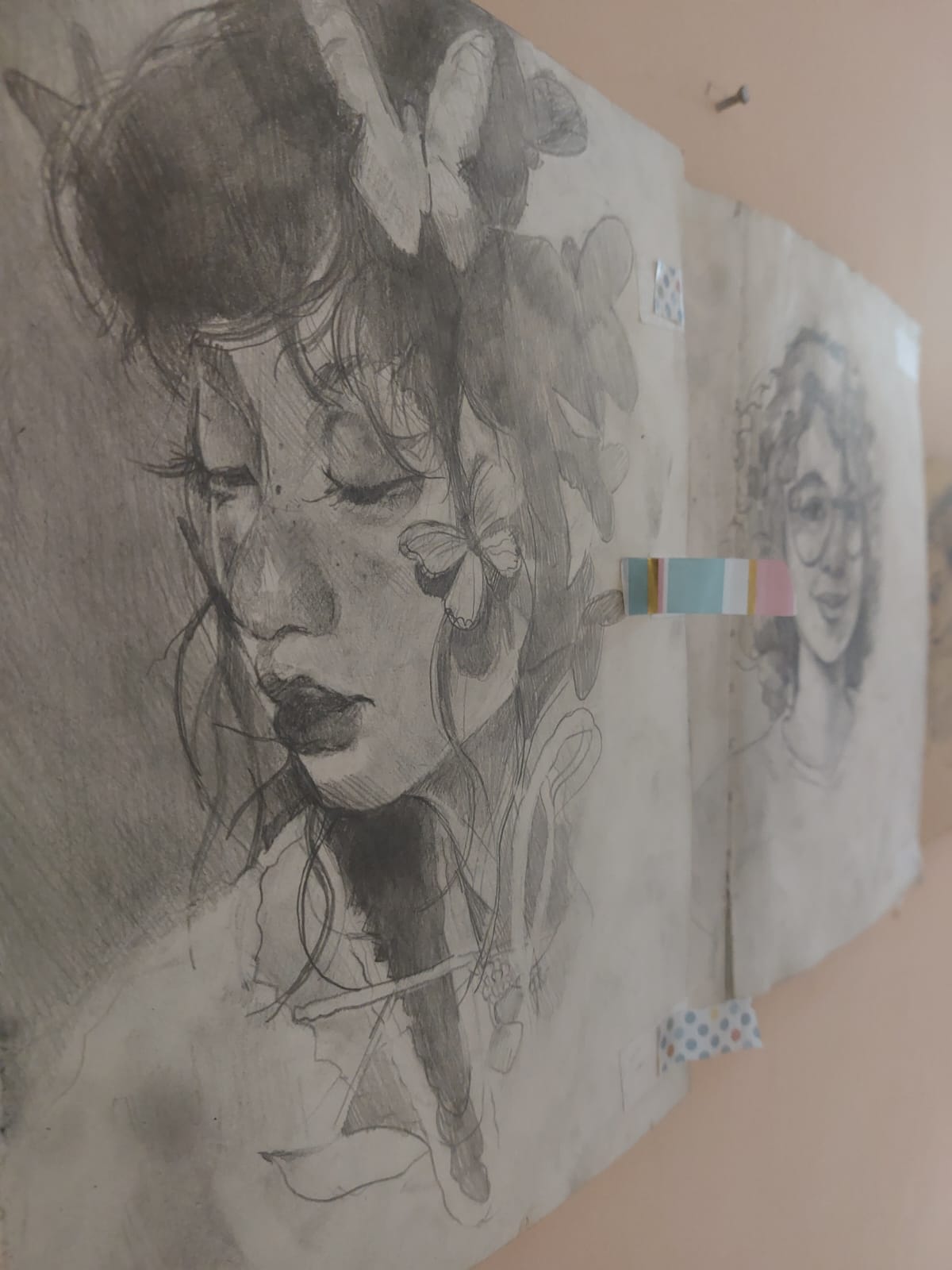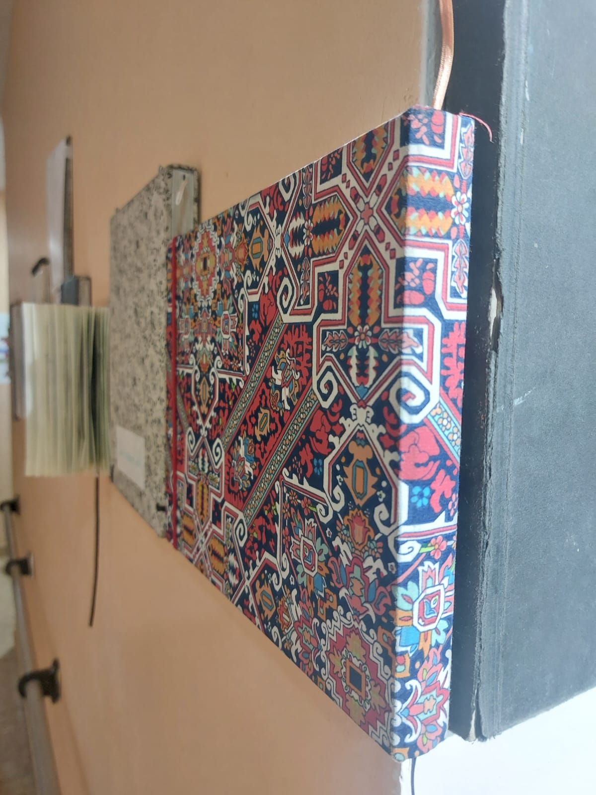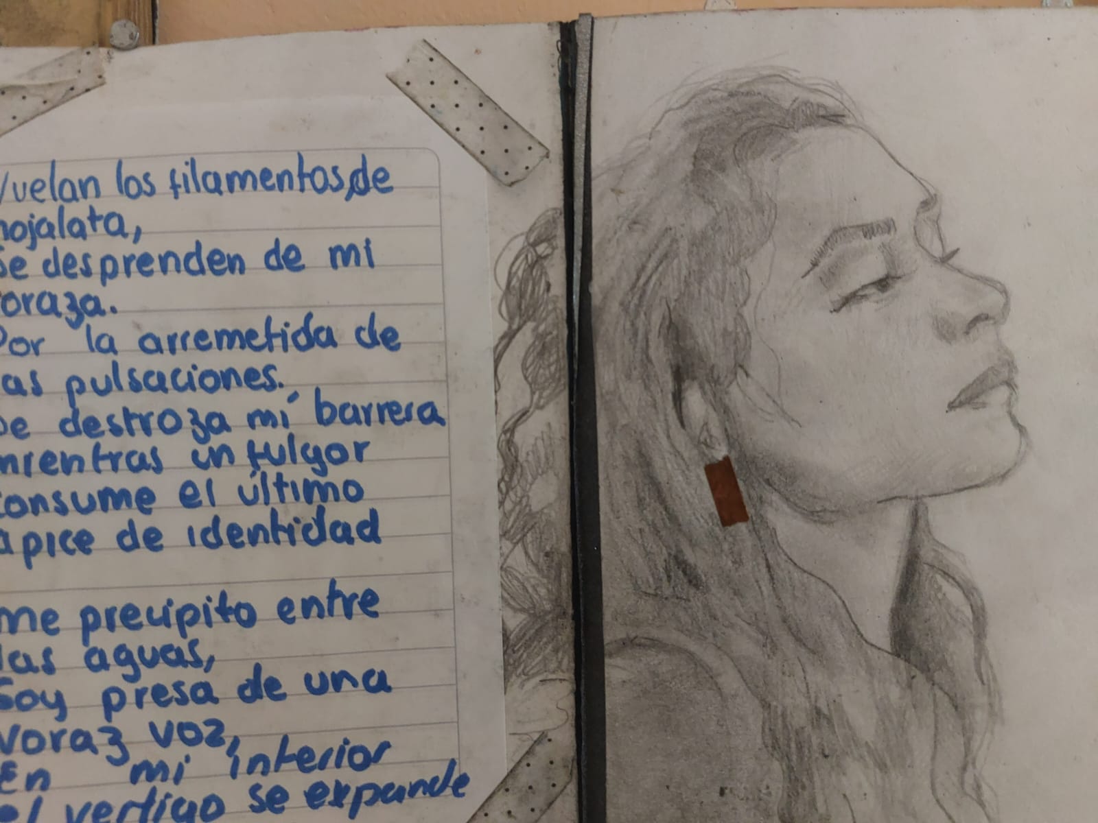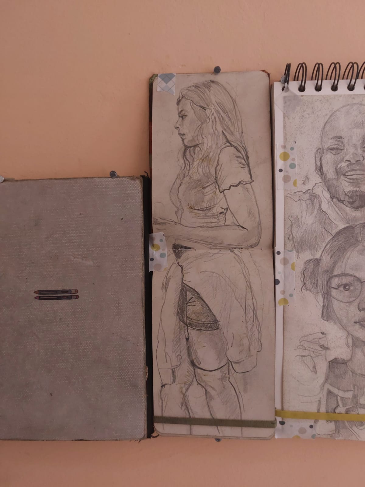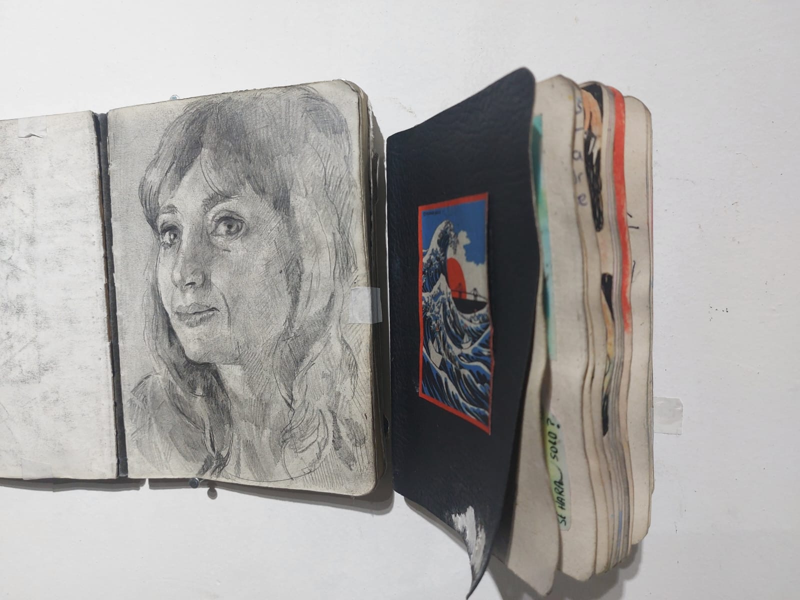 En el laboratorio he entendido a crear colecciones (historias, relatos, objetos, fotografías, dibujos, etc) que relatan discursos a partir de ese aparente sencillo acto de agrupar, enmarcar e hilar. Para esta exposición he elegido mi colección de libretas, situando como protagonista los bosquejos ylos experimentos que cargo siempre en mi maleta. Esta instalación la entiendo como un fuselaje de papel, los cuales evocan ese recuerdo físico que tengo mi persecución con el acto de dibujar, como quien recaba cada apertura de tiempo para acoger un oficio y reviste la propia piel como el lomo de una libreta.