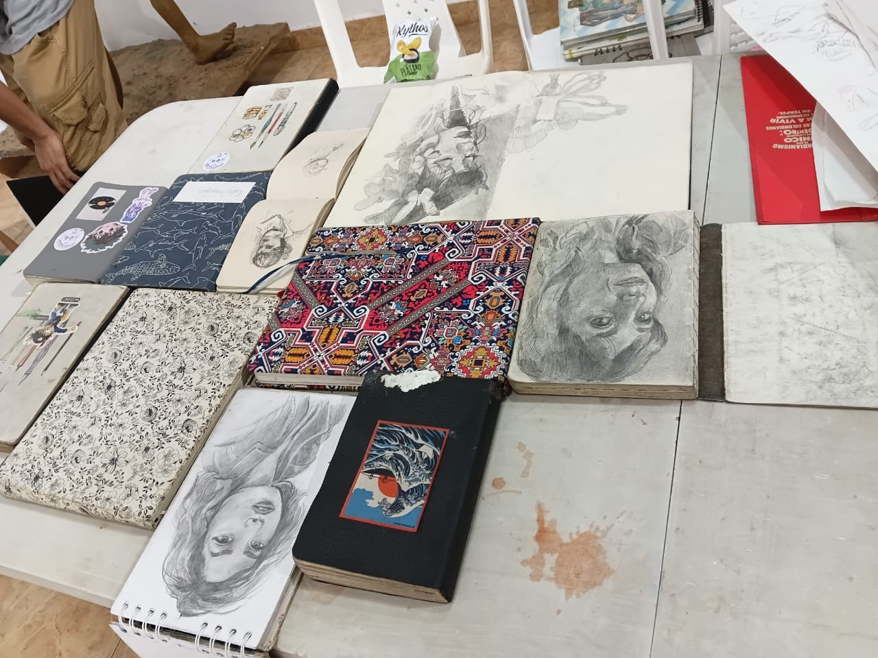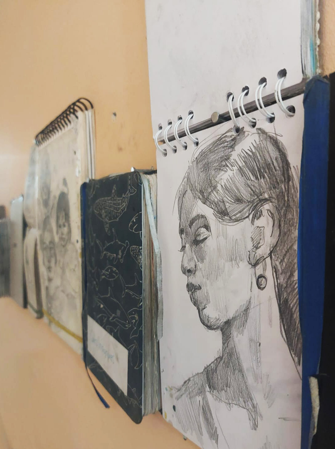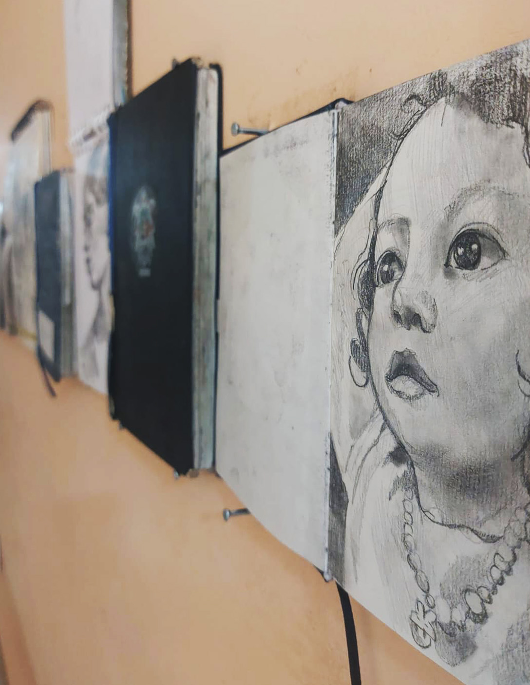 En el laboratorio he entendido a crear colecciones (historias, relatos, objetos, fotografías, dibujos, etc) que relatan discursos a partir de ese aparente sencillo acto de agrupar, enmarcar e hilar. Para esta exposición he elegido mi colección de libretas, situando como protagonista los bosquejos ylos experimentos que cargo siempre en mi maleta. Esta instalación la entiendo como un fuselaje de papel, los cuales evocan ese recuerdo físico que tengo mi persecución con el acto de dibujar, como quien recaba cada apertura de tiempo para acoger un oficio y reviste la propia piel como el lomo de una libreta.